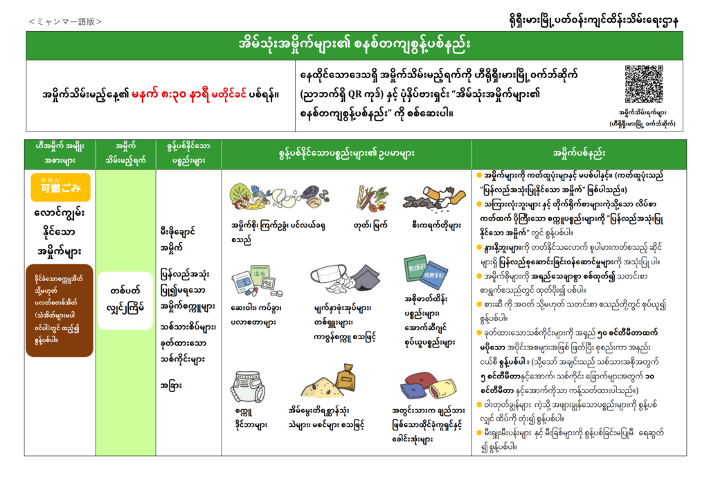 ミャンマー語版「家庭ごみの正しい出し方」(အိမ်သုံးအမှိုက်များ၏ စနစ်တကျစွန့်ပစ်နည်း)