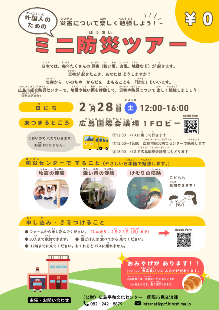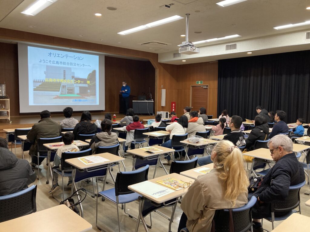 広島市総合防災センター指導員により、日本で頻発する災害(地震・風水害・火災)について、火災や風水害の発生原因、過去の大災害、地震の震度等について、やさしい日本語で学びました。
