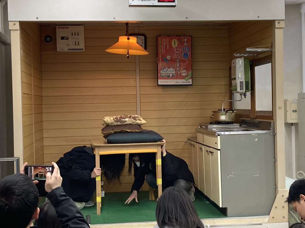 「震度6弱」の揺れを体験し、机の下に潜って頭を守る体勢を学びました。