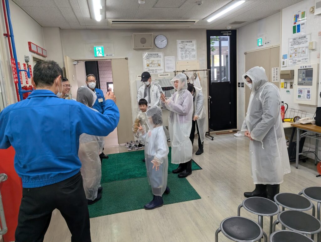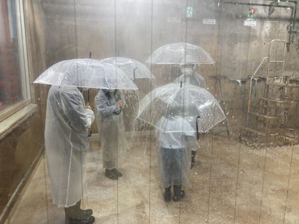 カッパや長靴を装着した上で近年広島市で頻発している豪雨を体験し、豪雨の中の視界不良やお互いの声が聞こえない状況を体験することで、豪雨時の外出の危険性などを学びました。