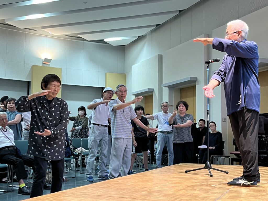 日本中国友好協会広島支部の皆さんによる太極拳を披露をいただきました。太極拳を披露いただいた後に、太極拳の型の動きにあわせて動作の意味や動きなどの解説をいただきました。太極拳は中国の拳法の一種ですが、現在では健康増進の体操として広く行われています。一つひとつの型の理解を深めた後は、椅子から腰を上げて立ち上がり、会場の皆さんで太極拳を体験しました。体と心がほぐされ、健康的なリフレッシュとなりました。