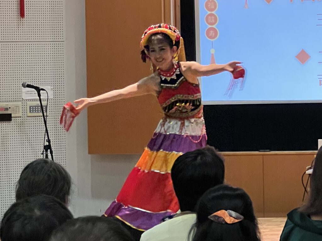 華やかな民族衣装をまとった三浦琉璃さんの中国の生活や文化を感じる華やかな舞踊に、二胡の演奏が加わり、お二人が一体となった華やかなコラボレーションを通して、さまざまな民族から成る中国独自の文化を感じることのできる機会となりました。