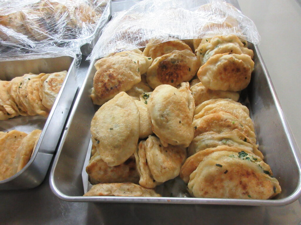 「韭菜盒子(ジゥツァイホーズ)」と「奶芙条(ナイフティャオ)」の試食を行いました。