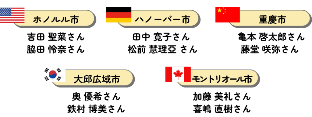 ※現在、ボルゴグラード市(ロシア)担当のヒロシマ・メッセンジャーはウクライナ情勢を鑑み欠員としています。