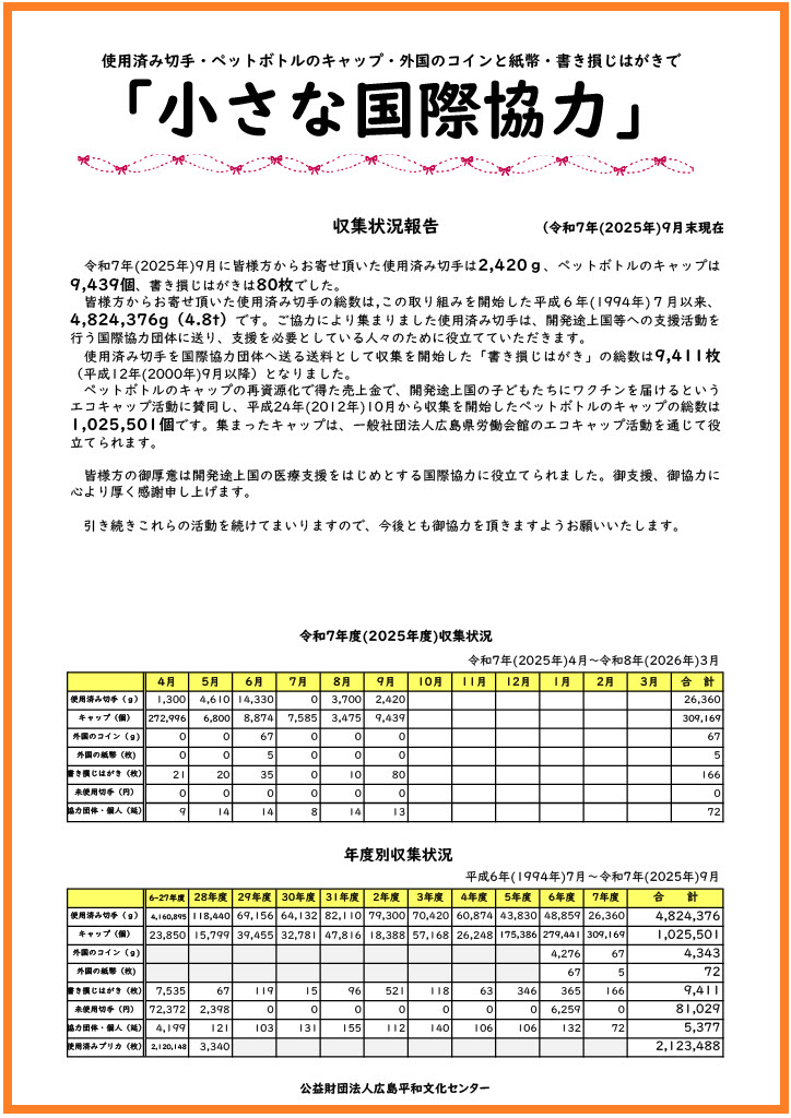 令和7年(2025年)9月に皆様方からお寄せ頂いた使用済み切手は2,420g、ペットボトルのキャップは9,439個、書き損じはがきは80枚でした。