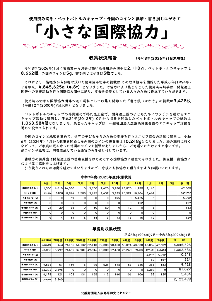 令和8年(2026年)1月に皆様方からお寄せ頂いた使用済み切手は2,110g、ペットボトルのキャップは8,662個、外国のコインは5g、書き損じはがきは5枚でした。
