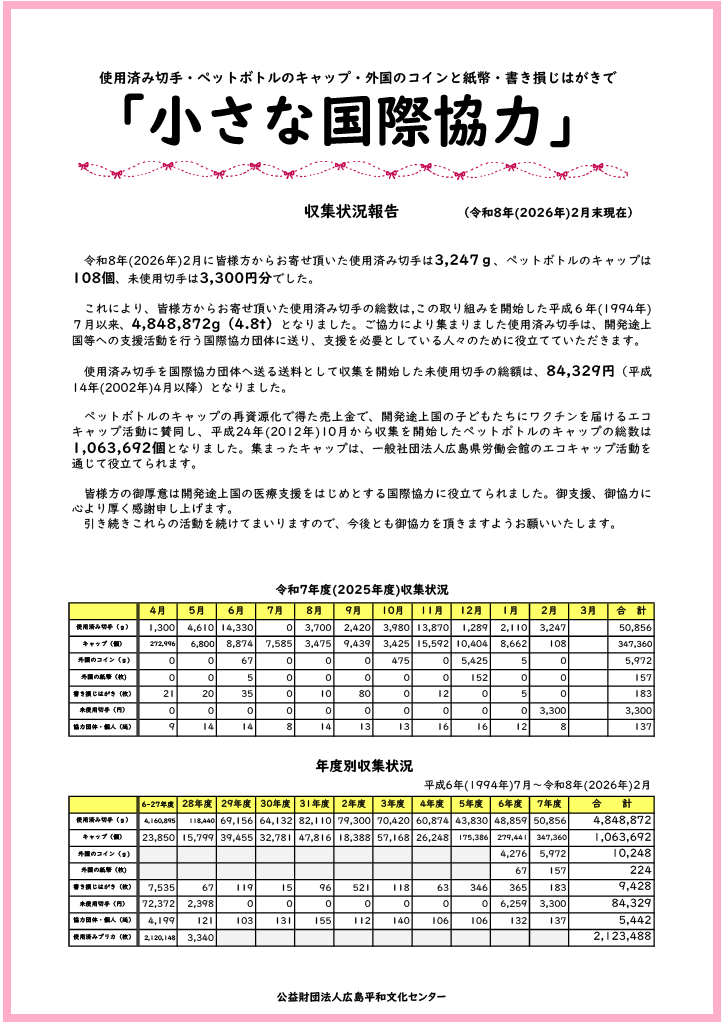 令和8年(2026年)2月に皆様方からお寄せ頂いた使用済み切手は3,247g、ペットボトルのキャップは108個、未使用切手は3,300円分でした。